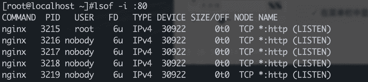 列出80端口目前打开的文件列表。