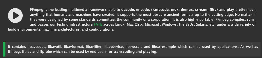 大致的意思:FFmpeg是一款多媒体框架,能处理音频、视频等,不管什么格式的数据都可以进行处理,支持MacOS、Windows、Linux等各种系统。