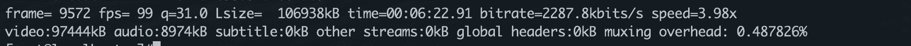 | [root@localhost ~] ffmpeg version 4.2.1 Copyright (c) 2000-2019 the FFmpeg developers built with gcc 4.8.5 (GCC) 20150623 (Red Hat 4.8.5-39) configuration: --enable-shared --prefix=/usr/local/ffmpeg libavutil 56. 31.100 / 56. 31.100 libavcodec 58. 54.100 / 58. 54.100 libavformat 58. 29.100 / 58. 29.100 libavdevice 58. 8.100 / 58. 8.100 libavfilter 7. 57.100 / 7. 57.100 libswscale 5. 5.100 / 5. 5.100 libswresample 3. 5.100 / 3. 5.100 Input Metadata: major_brand : mp42 minor_version : 0 compatible_brands: mp42mp41 creation_time : 2019-12-12T07:49:20.000000Z Duration: 00:06:22.93, start: 0.000000, bitrate: 10291 kb/s Stream Metadata: creation_time : 2019-12-12T07:49:20.000000Z handler_name : ?Mainconcept Video Media Handler encoder : AVC Coding Stream Metadata: creation_time : 2019-12-12T07:49:20.000000Z handler_name : At least one output file must be specified