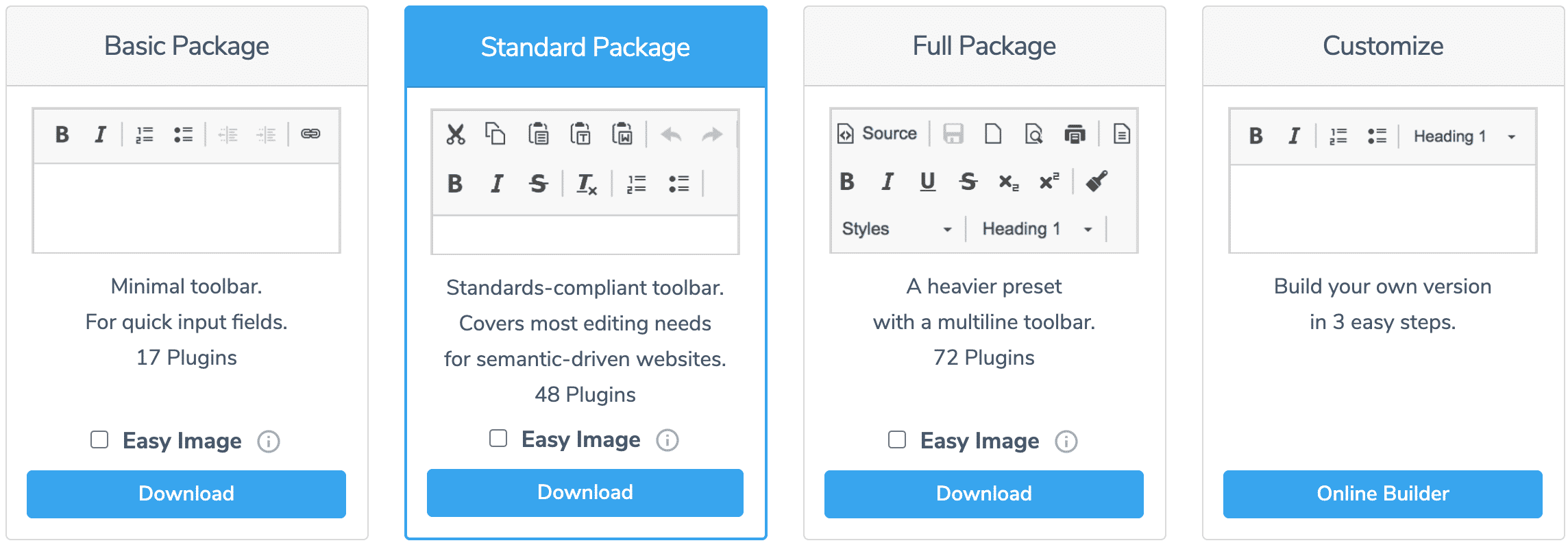 CkEditor4有4个版本下载:base(基础版)、standard(标准版)、full(完整版)、custome(定制版)。